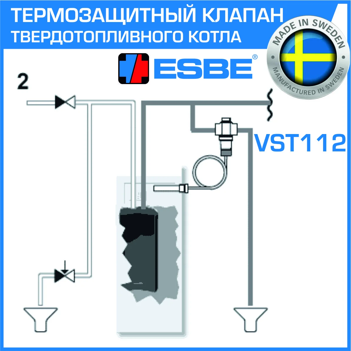 —Термический предохранительный клапан 3/4" ВР ESBE VST112 серии VST100 с капиллярной трубкой и гильзой / Устройство защиты ТТ котла до 100 кВт